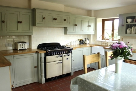 I don’t know what paint was used on these cabinets, however a similar look can be achieved using chalk paint.